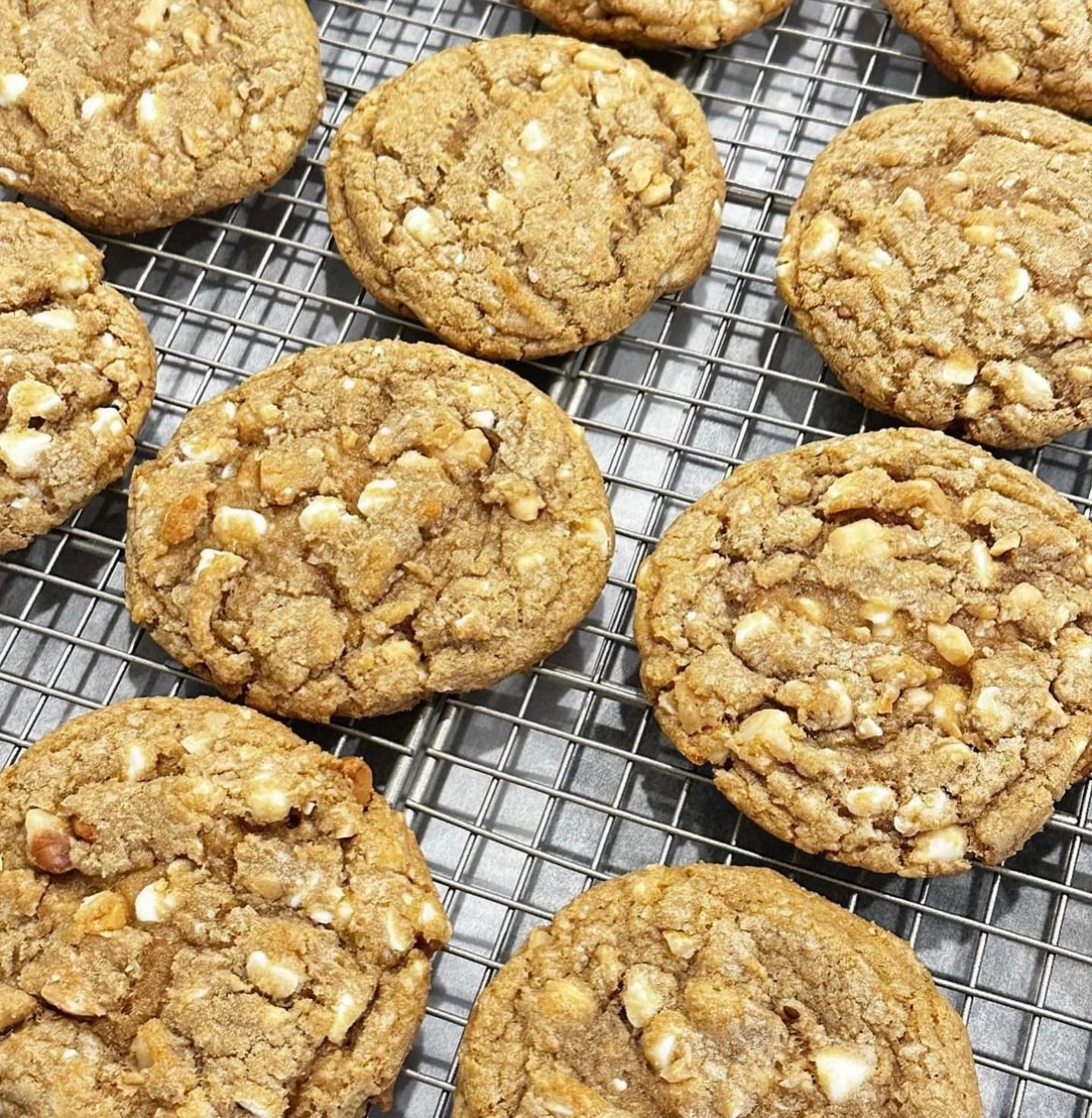 chocolate chip, harvest oatmeal, sweet + salty butterscotch, cowboy, m+m, sugar, peanut butter, white chocolate macadamia